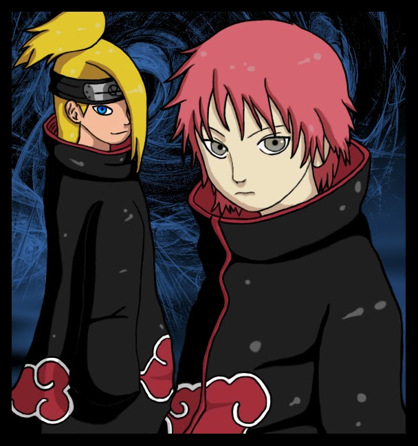 Diedara and sasori:Deidara and Sasori were known for being artists. Deidara uses clay to model his explosive animals and Sasori was a master puppet maker. Deidara acted as the junior in their partnership, deferring to Sasori as the stronger ninja. This did not stop them from getting into spats about the nature of art though. After Sasori's death, Tobi assumed his position and role as Deidara's partner. Deidara was assigned to capture the Ichibi and Tobi the Sanbi. Sasori did not know where his Jinchuuriki was. It is unknown if this was the Sanbi or some other individual.